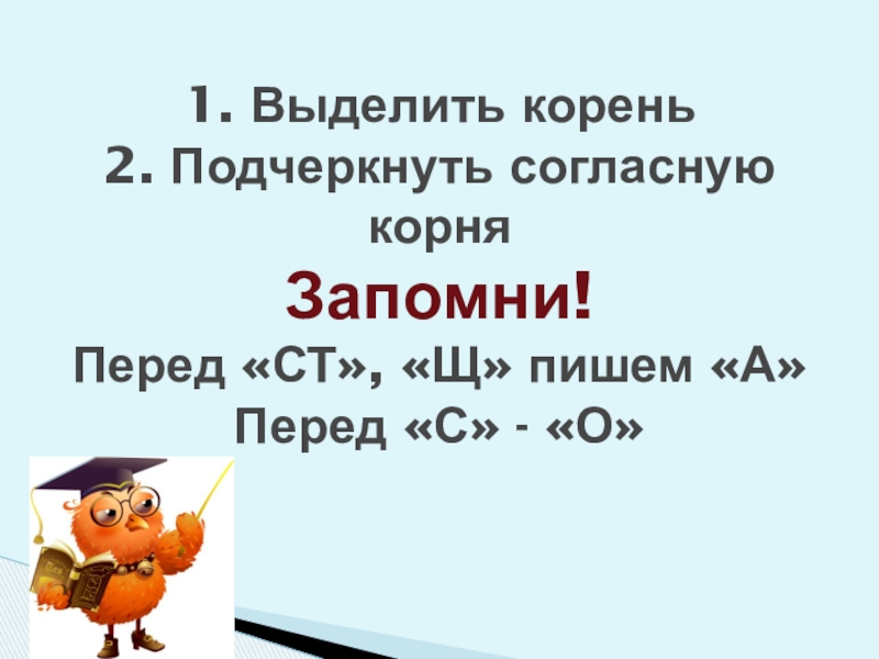 1. Выделить корень 2. Подчеркнуть согласную корня Запомни! Перед «СТ», «Щ» пишем «А»