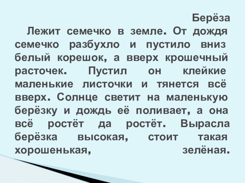 Берёза 	Лежит семечко в земле. От дождя семечко разбухло и пустило вниз белый корешок, а вверх