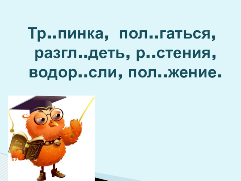 Слайд 2Тр..пинка, пол..гаться, разгл..деть, р..стения, водор..сли, пол..жение.