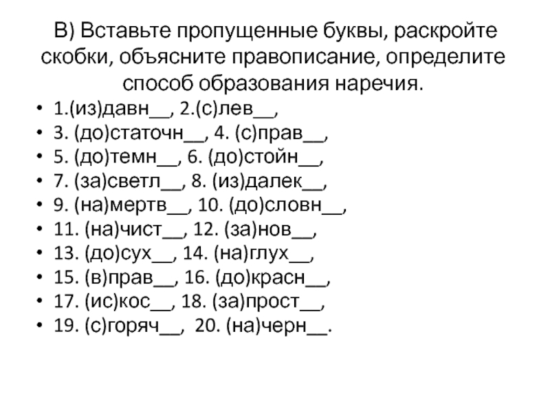 9. (на)мертв__, 10. (до)словн__,