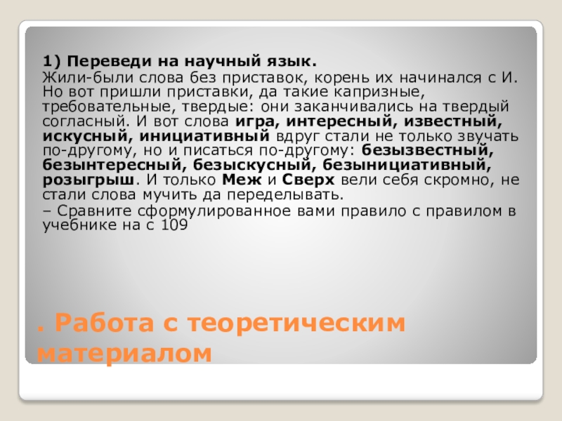 . Работа с теоретическим материалом1) Переведи на научный язык.Жили-были слова без приставок, корень их начинался с И.