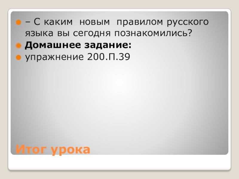 Итог урока– С каким новым правилом русского языка вы сегодня познакомились?Домашнее задание: упражнение 200.П.39