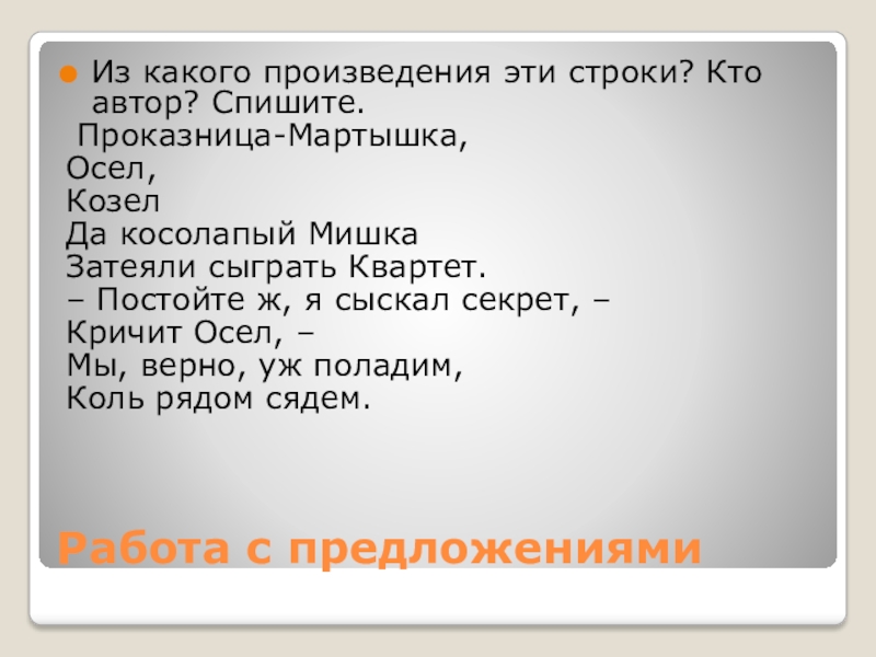 Работа с предложениямиИз какого произведения эти строки? Кто автор? Спишите. Проказница-Мартышка,Осел,КозелДа косолапый МишкаЗатеяли сыграть Квартет.– Постойте ж, я сыскал секрет, –Кричит Осел, –Мы, верно, уж поладим,Коль рядом сядем.