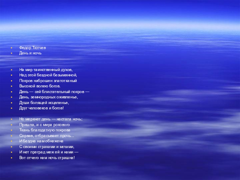 Единство его философской лирике придает эмоциональный тон – постоянная, неясная тревога. Поэт слушает всемирное молчание покинутой, осиротелой жизни (вообще жизнь человека на земле для Тютчева есть призрак, сон.)