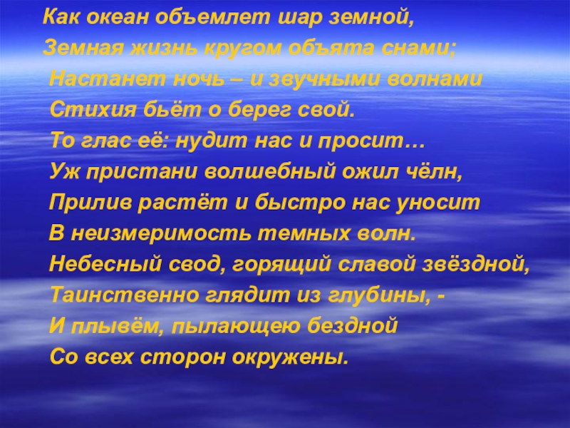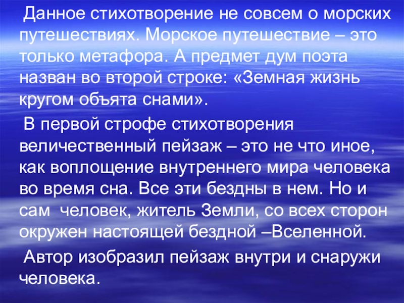 В первой строфе стихотворения величественный пейзаж – это не что иное, как воплощение внутреннего мира человека во время сна. Все эти бездны в нем. Но и сам человек, житель Земли, со всех сторон окружен настоящей бездной –Вселенной.