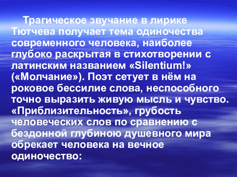 Тютчева получает тема одиночества современного человека, наиболее глубоко раскрытая в стихотворении с латинским названием «Silentium!» («Молчание»). Поэт сетует в нём на роковое бессилие слова, неспособного точно выразить живую мысль и чувство. «Приблизительность», грубость человеческих слов по сравнению с бездонной глубиною душевного мира обрекает человека на вечное одиночество: