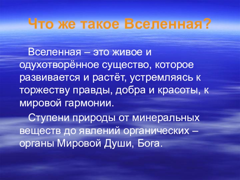 одухотворённое существо, которое развивается и растёт, устремляясь к торжеству правды, добра и красоты, к мировой гармонии.