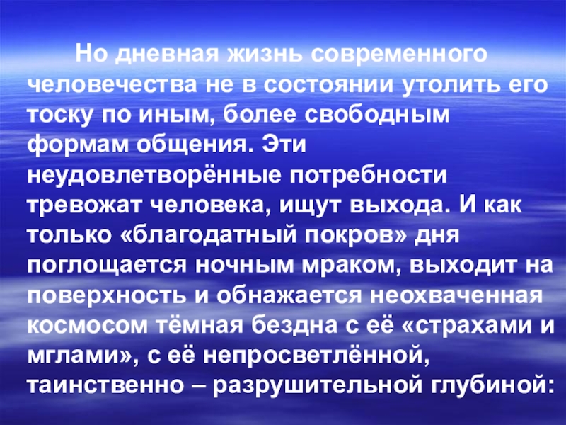 дневная жизнь современного человечества не в состоянии утолить его тоску по иным, более свободным формам общения. Эти неудовлетворённые потребности тревожат человека, ищут выхода. И как только «благодатный покров» дня поглощается ночным мраком, выходит на поверхность и обнажается неохваченная космосом тёмная бездна с её «страхами и мглами», с её непросветлённой, таинственно – разрушительной глубиной: