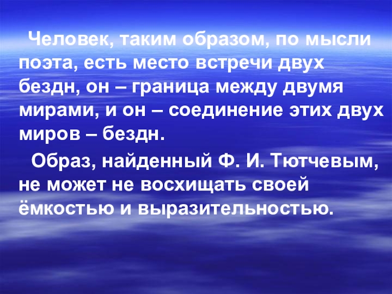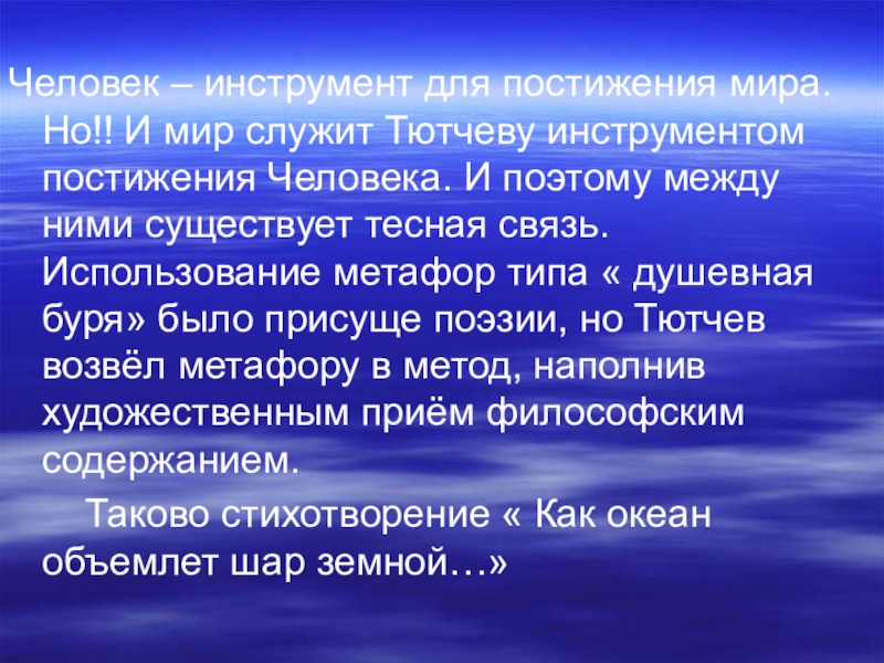 И мир служит Тютчеву инструментом постижения Человека. И поэтому между ними существует тесная связь. Использование метафор типа « душевная буря» было присуще поэзии, но Тютчев возвёл метафору в метод, наполнив художественным приём философским содержанием.