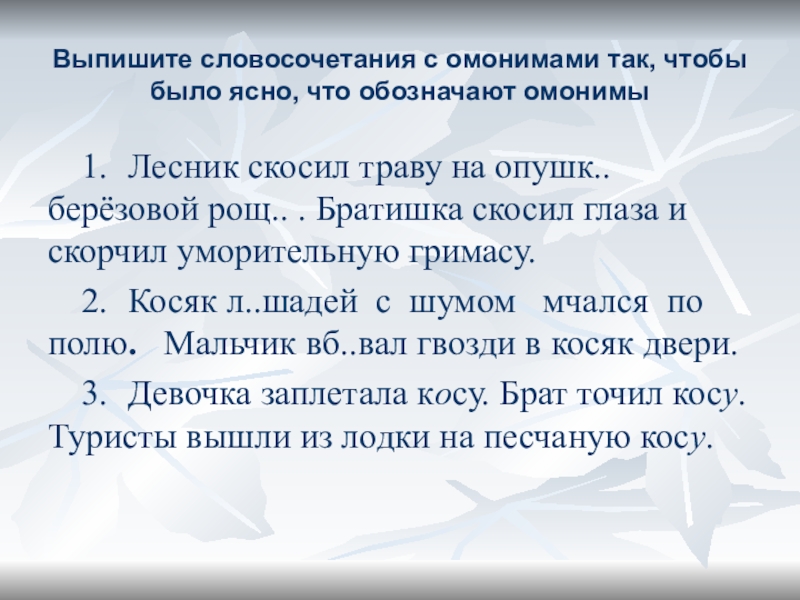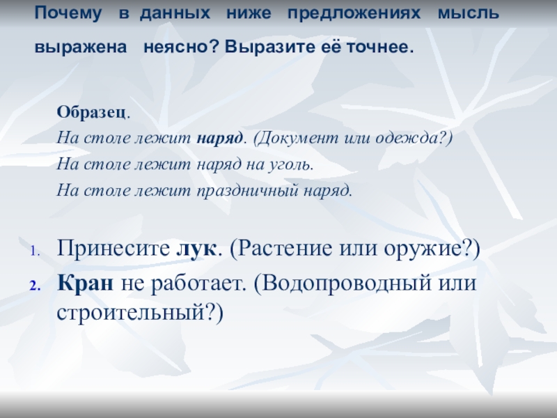 Стакан из стекла — вода стекла; косить косой — косой взгляд; теплую печь — печь пироги; разводить голубей — небо стало голубей; побелить потолок — потолок картошку.