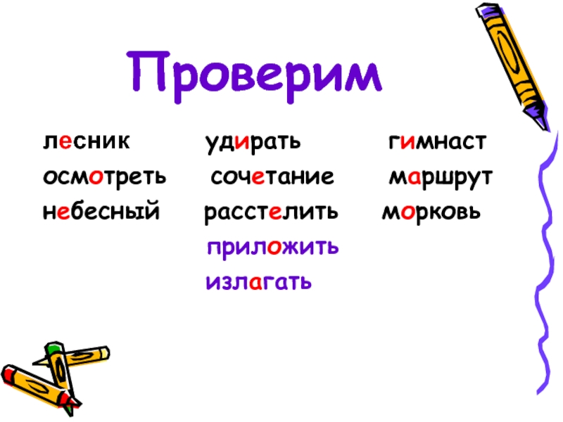 осм…треть, уд..рать, соч..тание, н…бесный, г…мнаст, прил…жить, изл…гать, расст..лить, м…ршрут, м…рковь.