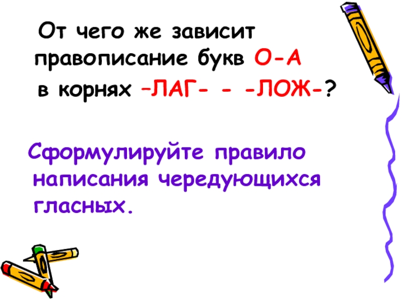 Слайд 1Буквы О – А в корне –ЛАГ- - - ЛОЖ-