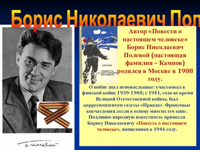 Автор «Повести о настоящем человеке» Борис Николаевич Полевой (настоящая фамилия – Кампов) родился в Москве в 1908 году.