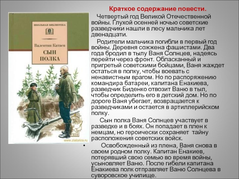 Валентин Петрович Катаев написал свою повесть «Сын полка» в 1944 году, в дни Великой Отечественной войны нашего народа с фашистскими захватчиками. Героями своей повести бывший артиллерист Катаев сделал тоже артиллеристов. Уже через год после ее выхода в свет был снят кинофильм «Сын полка».