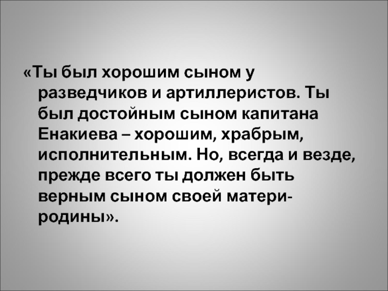 достойным сыном капитана Енакиева – хорошим, храбрым, исполнительным. Но, всегда и везде, прежде всего ты должен быть верным сыном своей матери-родины».