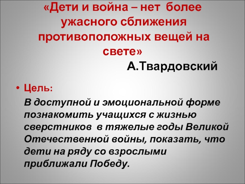В доступной и эмоциональной форме познакомить учащихся с жизнью сверстников в тяжелые годы Великой Отечественной войны, показать, что дети на ряду со взрослыми приближали Победу.