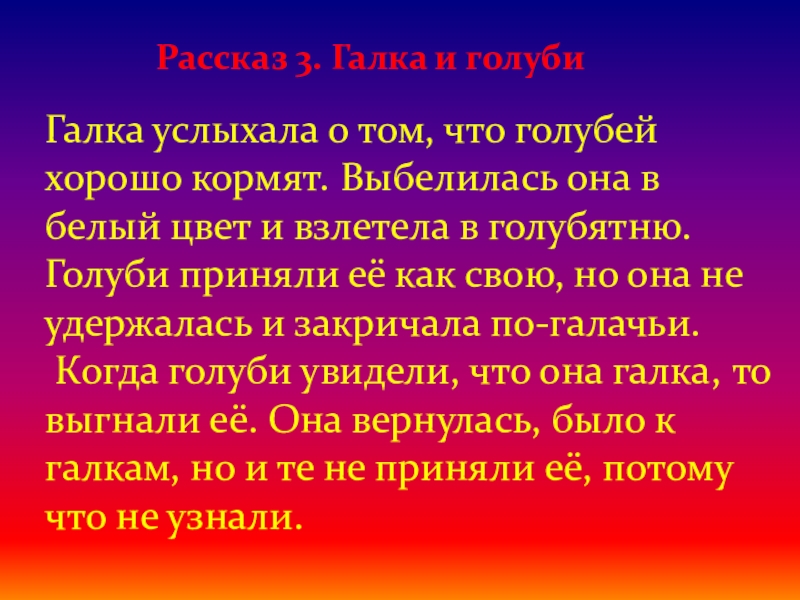 Галка услыхала о том, что голубей хорошо кормят. Выбелилась она в белый цвет и взлетела в голубятню. Голуби приняли её как свою, но она не удержалась и закричала по-галачьи.