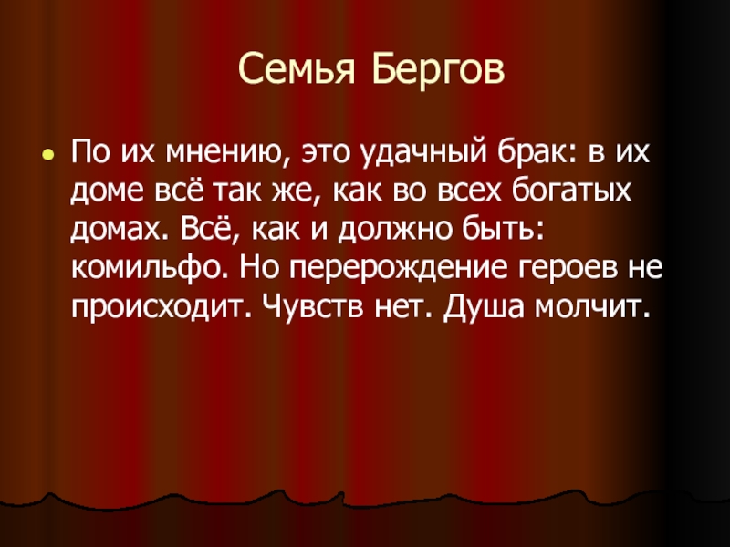 так же, как во всех богатых домах. Всё, как и должно быть: комильфо. Но перерождение героев не происходит. Чувств нет. Душа молчит.