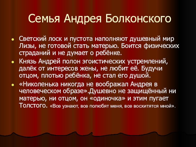 Князь Андрей полон эгоистических устремлений, далёк от интересов жены, не любит её. Будучи отцом, плотью ребёнка, не стал его душой.