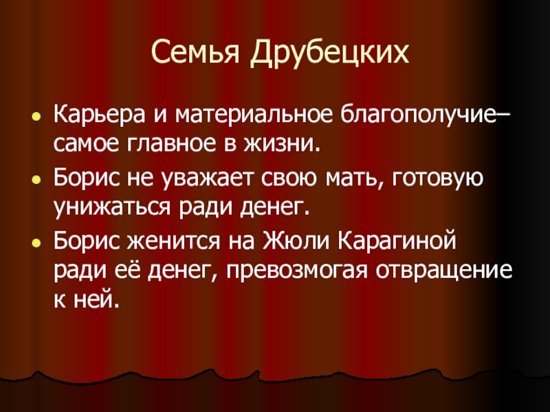 Борис женится на Жюли Карагиной ради её денег, превозмогая отвращение к ней.