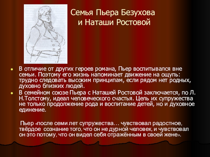 романа, Пьер воспитывался вне семьи. Поэтому его жизнь напоминает движение на ощупь: трудно следовать высоким принципам, если рядом нет родных, духовно близких людей.