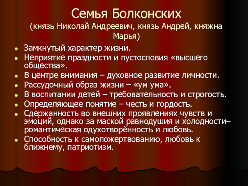 Семьи Болконских и Ростовых являют нам жизнь, руководимую нравственными законами, где