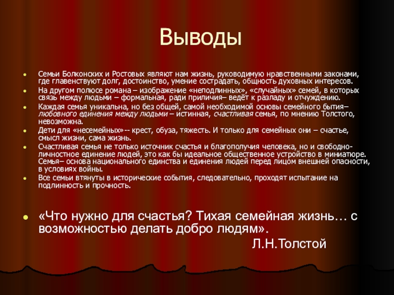 Каждая семья уникальна, но без общей, самой необходимой основы семейного бытия– любовного единения между людьми – истинная, счастливая семья, по мнению Толстого, невозможна.