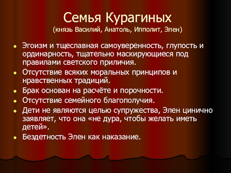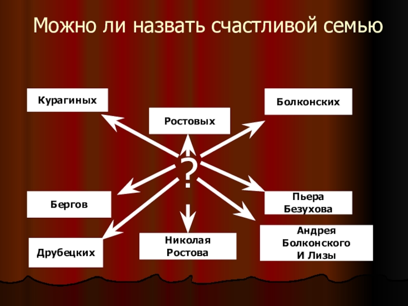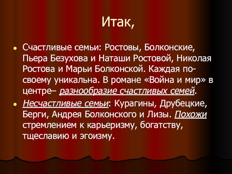 Несчастливые семьи: Курагины, Друбецкие, Берги, Андрея Болконского и Лизы. Похожи стремлением к карьеризму, богатству, тщеславию и эгоизму.