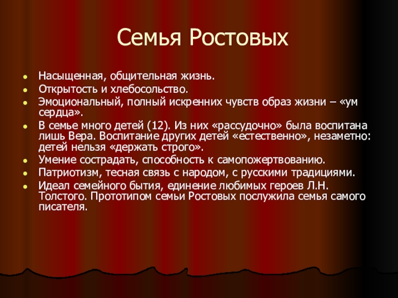 Идеал семейного бытия, единение любимых героев Л.Н.Толстого. Прототипом семьи Ростовых послужила семья самого писателя.