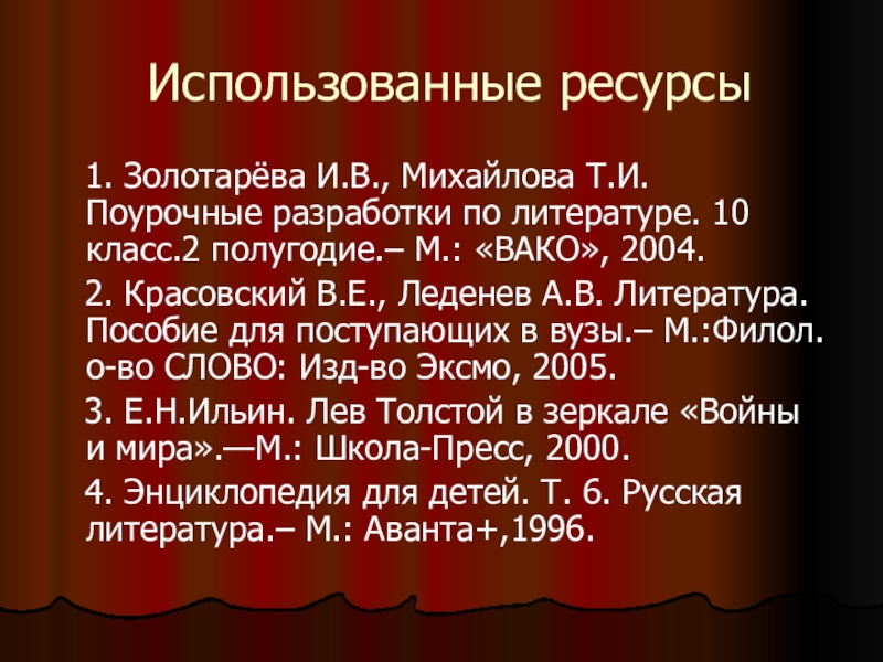 3. Е.Н.Ильин. Лев Толстой в зеркале «Войны и мира».—М.: Школа-Пресс, 2000.