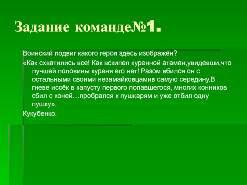 куренной атаман,увидевши,что лучшей половины куреня его нет! Разом вбился он с остальными своими незамайковцамив самую середину.В гневе иссёк в капусту первого попавшегося, многих конников сбил с коней…пробрался к пушкарям и уже отбил одну пушку».