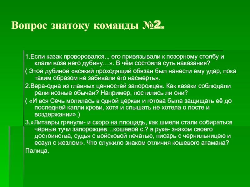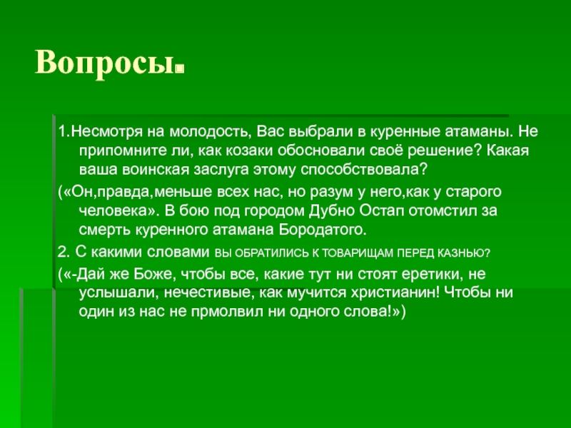 1.Несмотря на молодость, Вас выбрали в куренные атаманы. Не припомните ли,