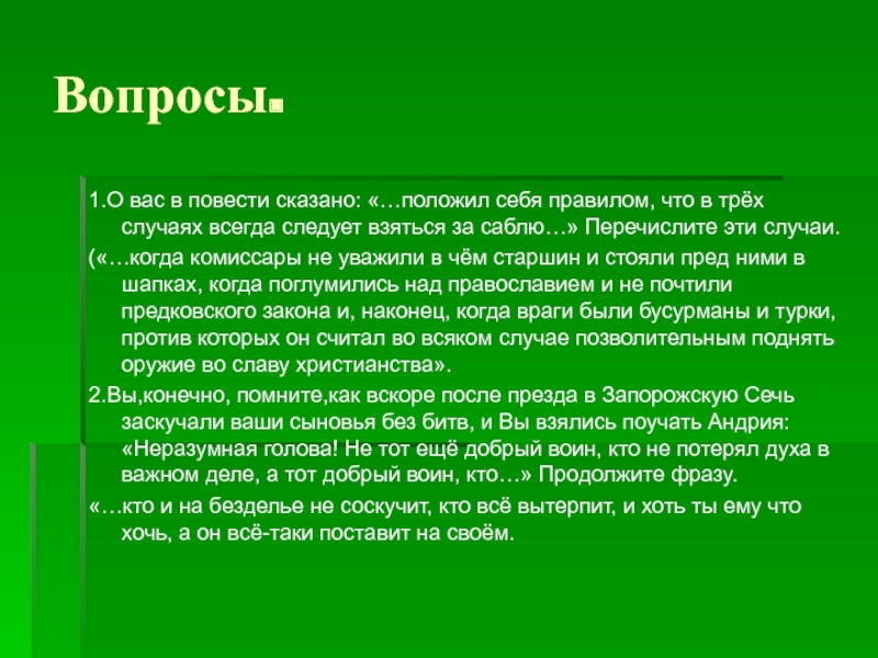 2.Вы,конечно, помните,как вскоре после презда в Запорожскую Сечь заскучали ваши сыновья без битв, и Вы взялись поучать Андрия: «Неразумная голова! Не тот ещё добрый воин, кто не потерял духа в важном деле, а тот добрый воин, кто…» Продолжите фразу.