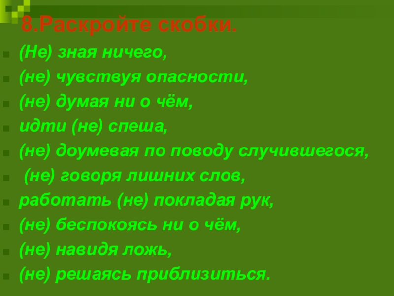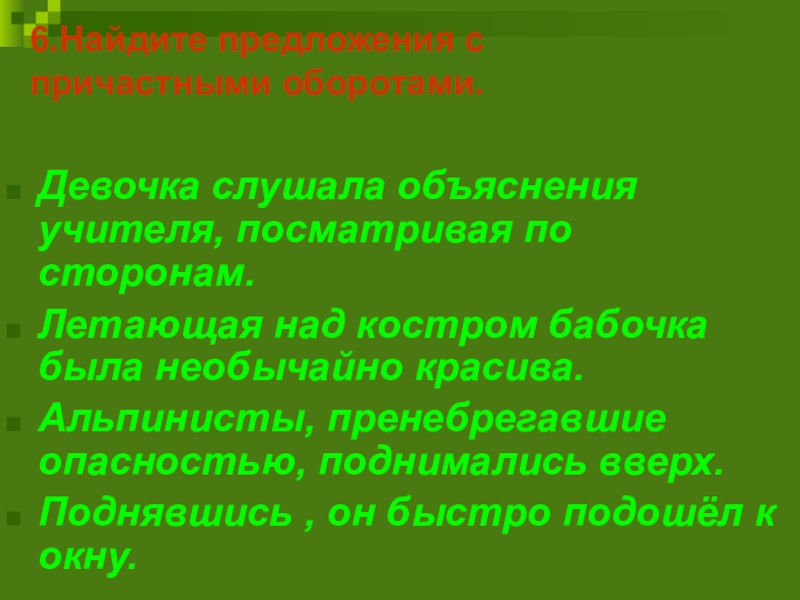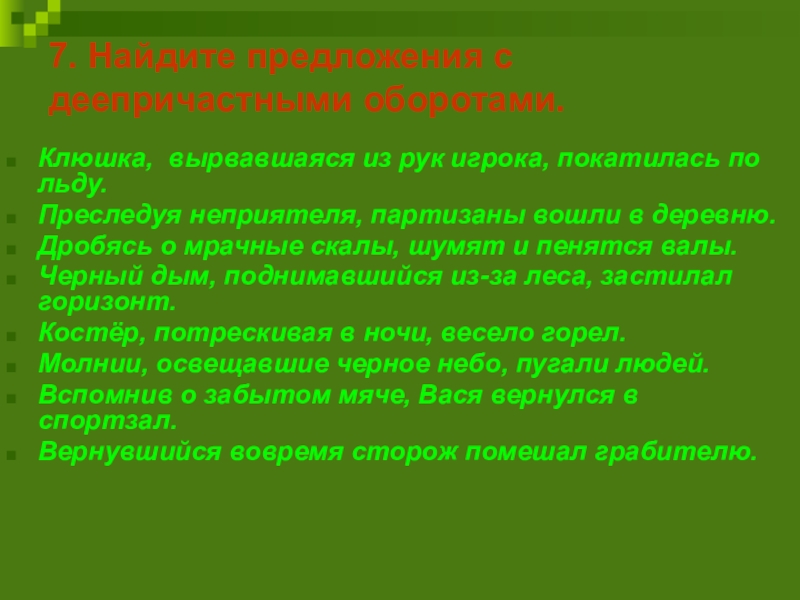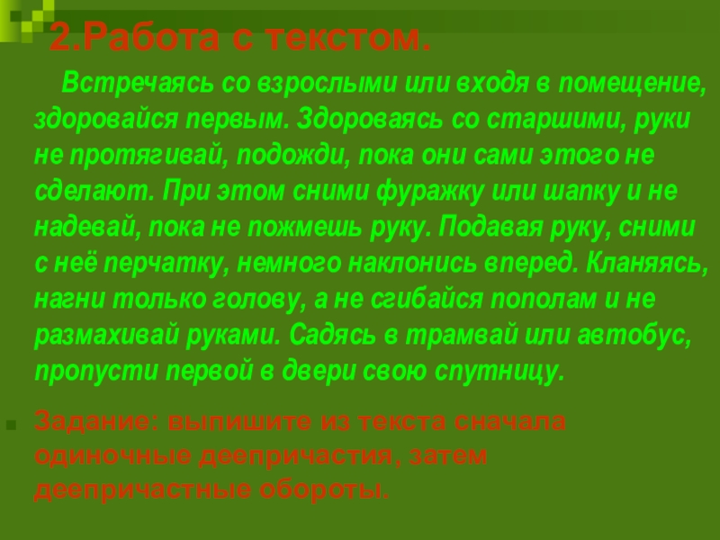 Задание: выпишите из текста сначала одиночные деепричастия, затем деепричастные обороты.