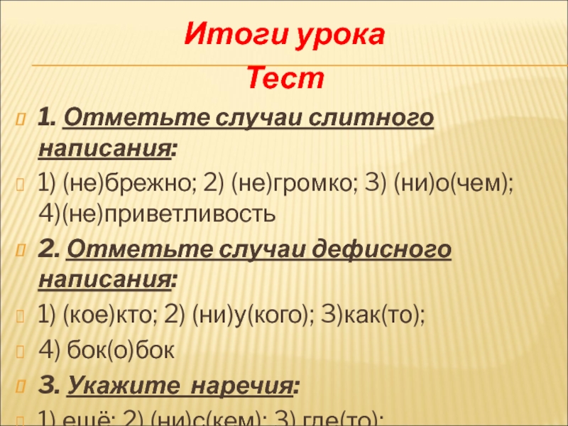1) (не)брежно; 2) (не)громко; 3) (ни)о(чем);
