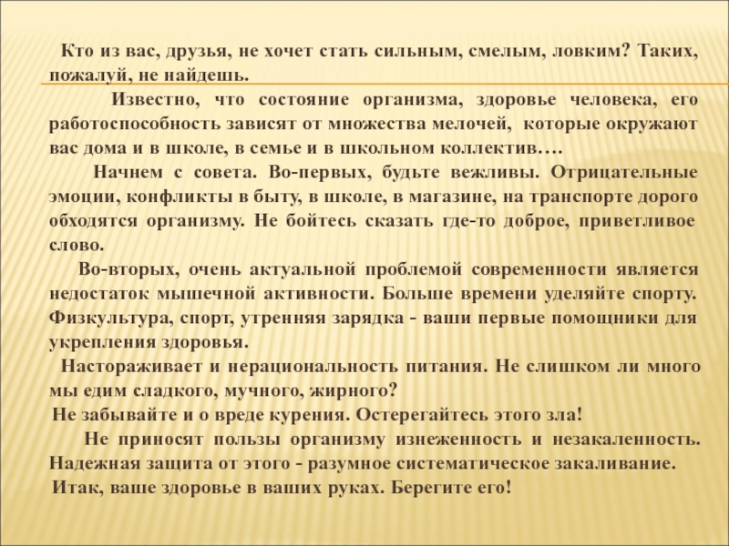 Известно, что состояние организма, здоровье человека, его работоспособность зависят от множества мелочей, которые окружают вас дома и в школе, в семье и в школьном коллектив….
