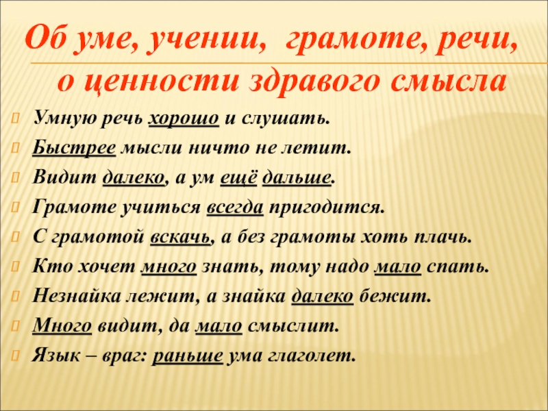 Слайд 18Об уме, учении, грамоте, речи, о ценности здравого смысла