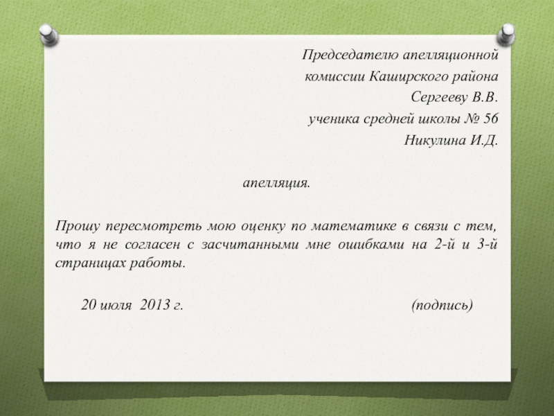 Председателю апелляционной комиссии Каширского района Сергееву В.В.ученика средней школы № 56 Никулина И.Д.апелляция.Прошу пересмотреть мою оценку