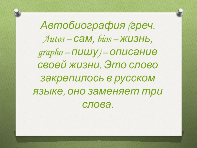 Автобиография (греч. Autos – сам, bios – жизнь, grapho – пишу) – описание своей жизни. Это слово