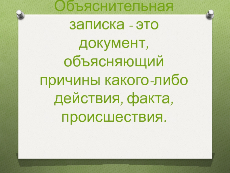Слайд 10Объяснительная записка - это документ, объясняющий причины какого-либо действия, факта, происшествия.
