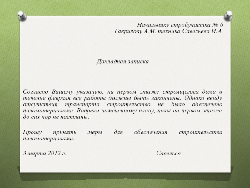 Начальнику стройучастка № 6 Гаврилову А.М. техника Савельева И.А.