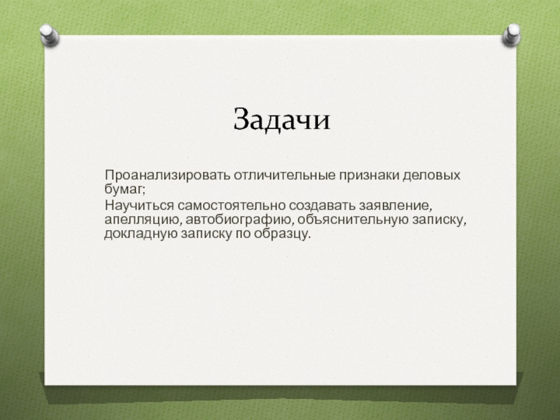 ЗадачиПроанализировать отличительные признаки деловых бумаг;Научиться самостоятельно создавать заявление, апелляцию, автобиографию, объяснительную записку, докладную записку по образцу.