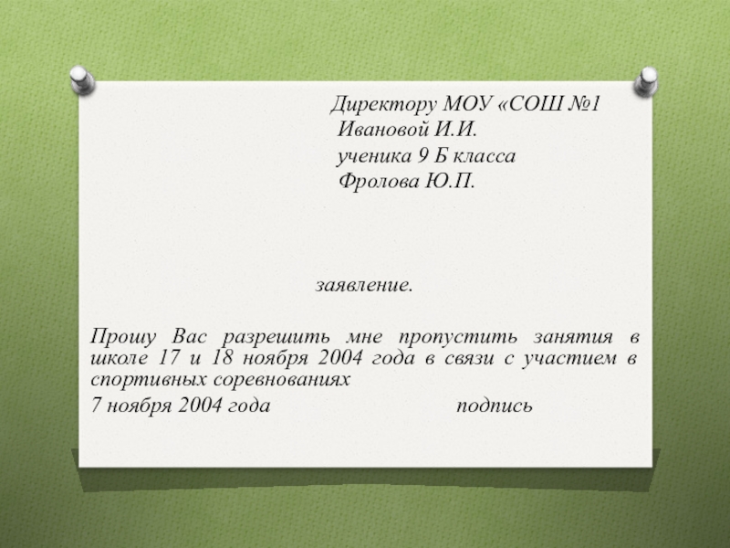Прошу Вас разрешить мне пропустить занятия в школе 17 и 18 ноября 2004 года в связи с участием в спортивных соревнованиях