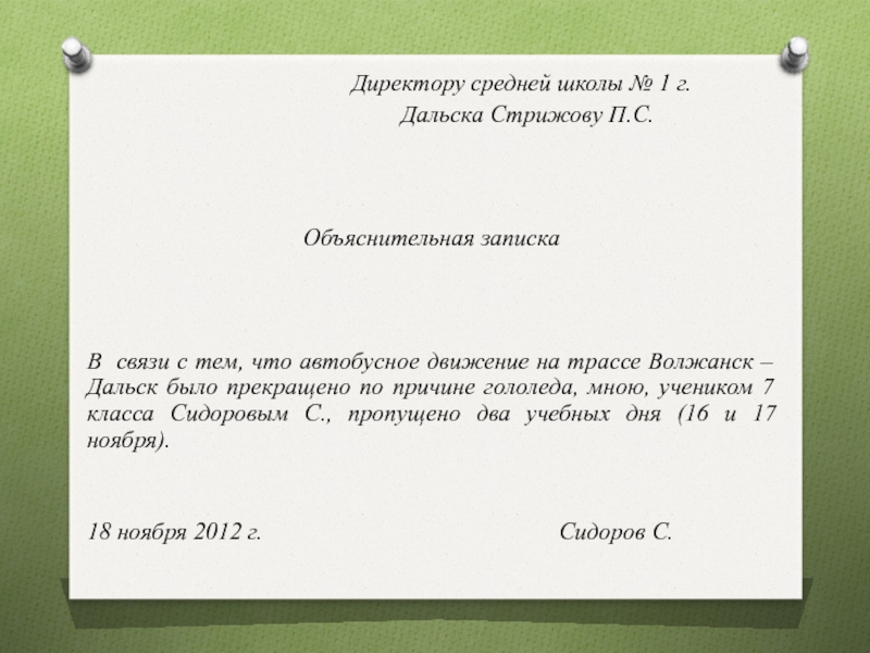 В связи с тем, что автобусное движение на трассе Волжанск – Дальск было прекращено по причине гололеда, мною, учеником 7 класса Сидоровым С., пропущено два учебных дня (16 и 17 ноября).