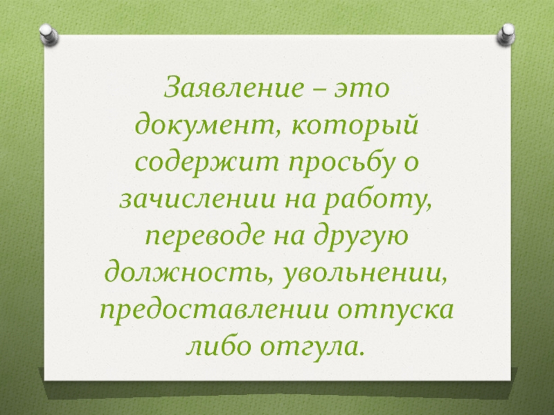 Слайд 4Заявление – это документ, который содержит просьбу о зачислении на работу,