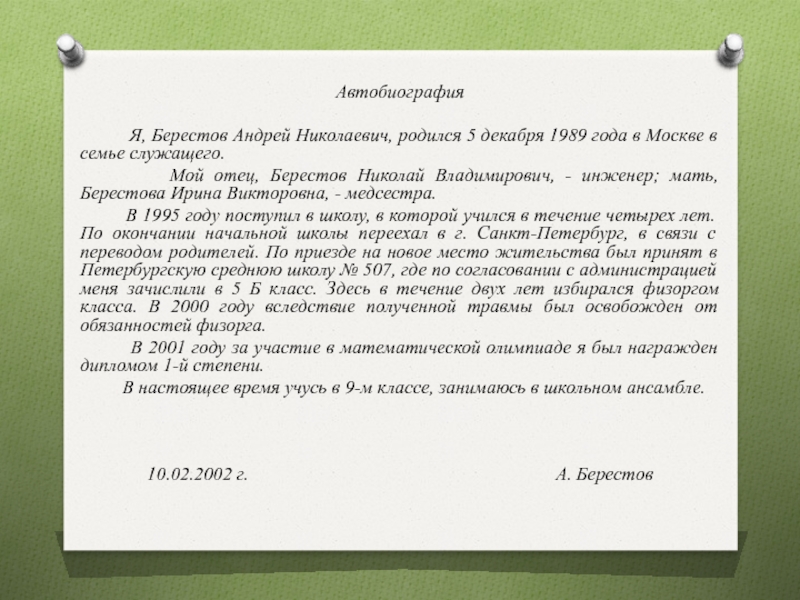Автобиография     Я, Берестов Андрей Николаевич, родился 5 декабря 1989 года в Москве в