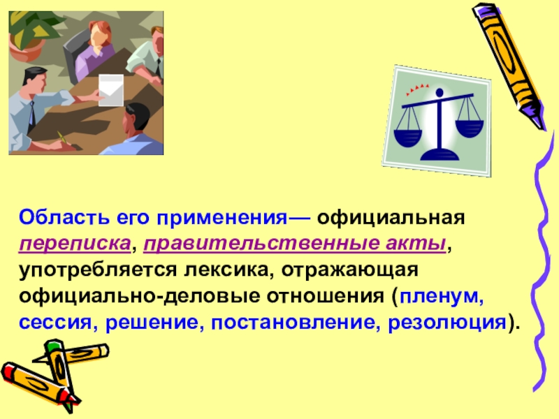 Официально-деловой стильОбласть его применения— официальная      переписка, правительственные акты,