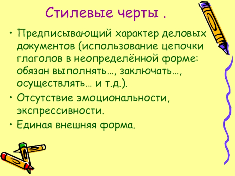 Стилевые черты . Предписывающий характер деловых документов (использование цепочки глаголов в неопределённой форме: обязан выполнять…, заключать…, осуществлять…