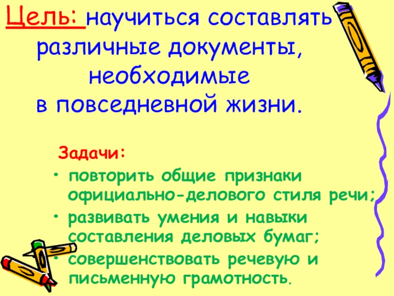 Слайд 2Цель: научиться составлять различные документы, необходимые в повседневной жизни.