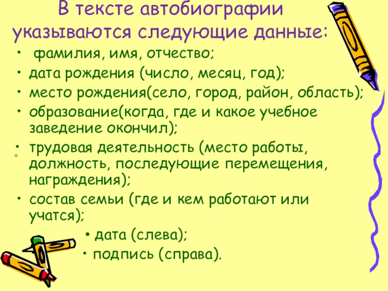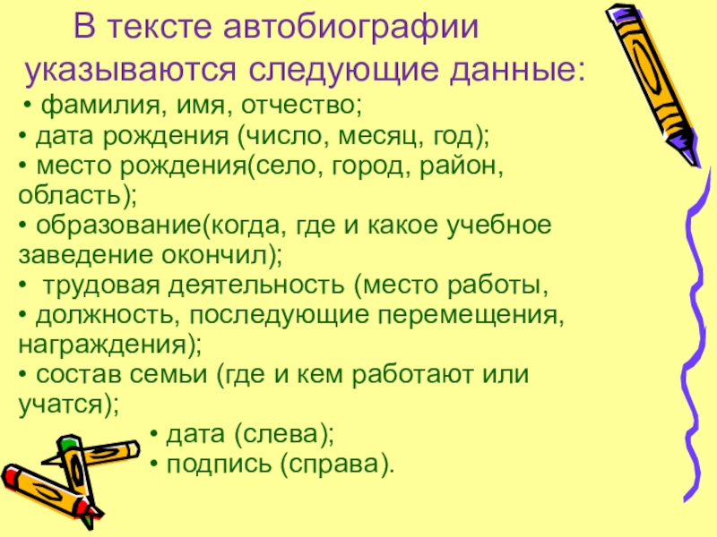 Слайд 8В тексте автобиографии указываются следующие данные: